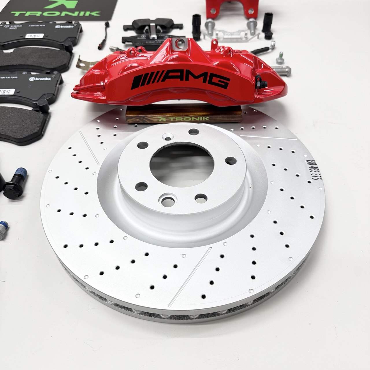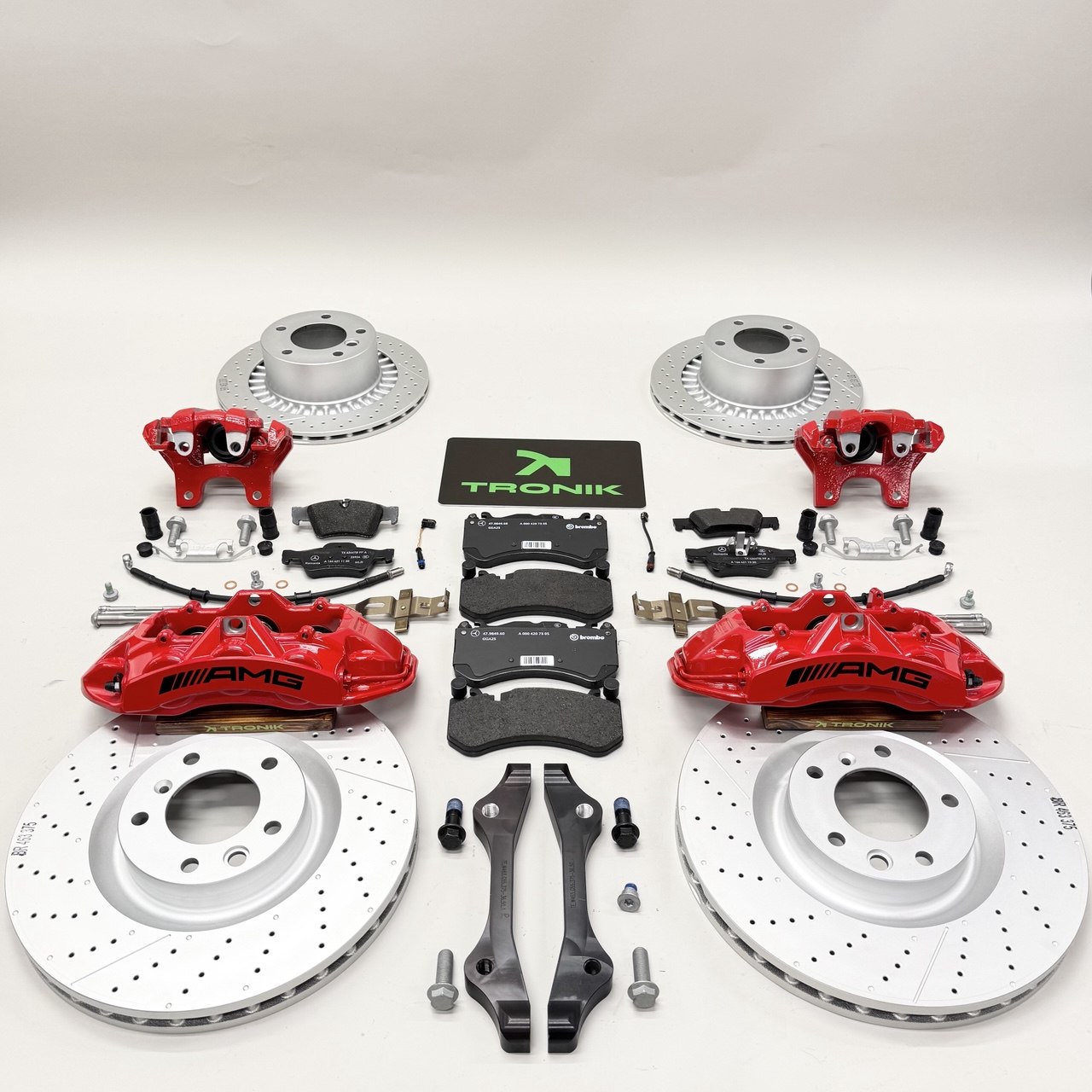 This is TRO-NIK developed big brake upgrade kit with brand new and genuine Mercedes-Benz brake calipers. Front calipers are 6-piston and Rear ones are 1-piston OEM calipers. The brake calipers are in Red color.  Front brake steel discs are 375x36mm and Rear discs are 330x32mm. Goodridge performance brake lines are reinforced with stainless steel mesh inside to improve braking force and durability. This kit will Significantly improve your breaking performance and add AMG look to your car.