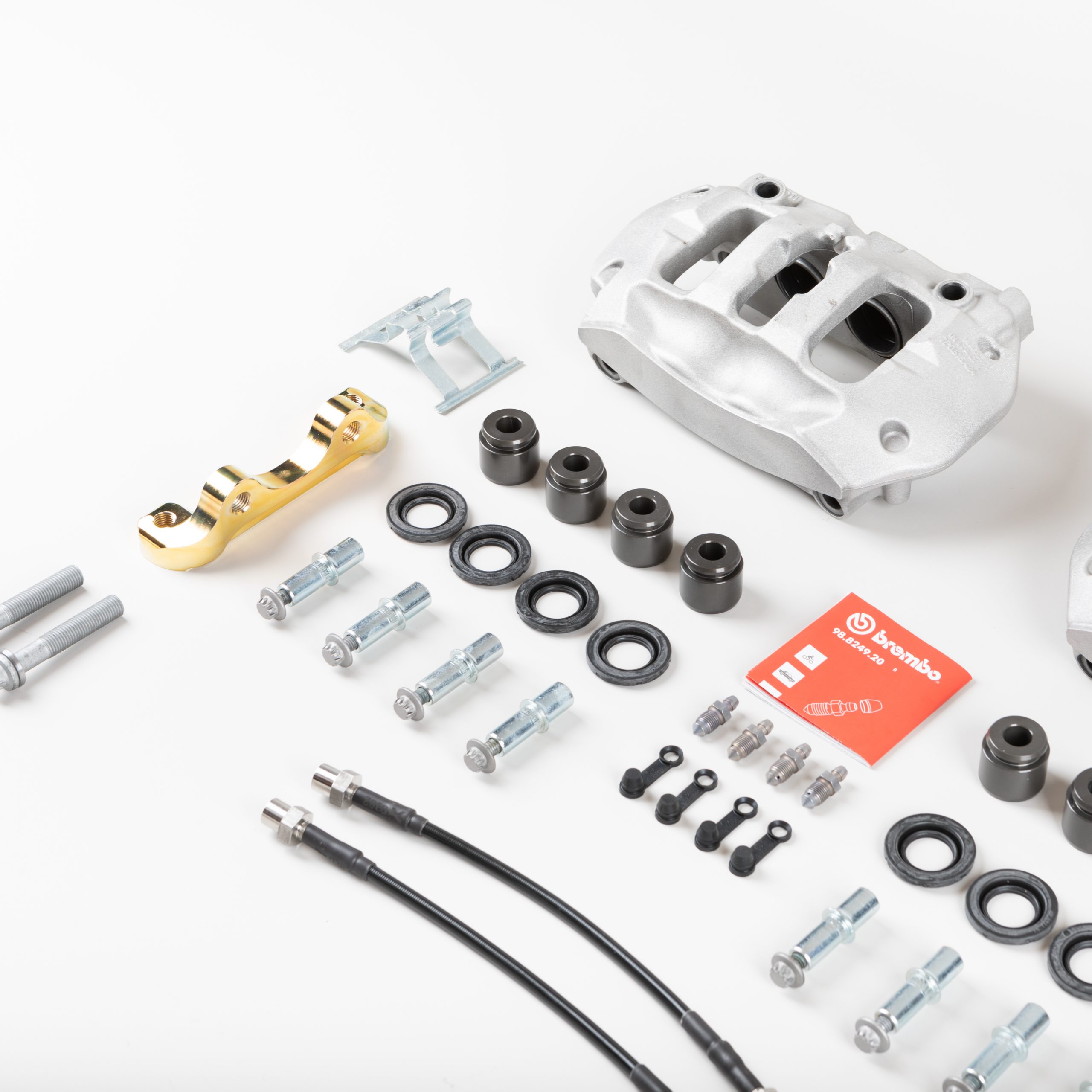Rear brake upgrade solution using our special TRO-NIK manufactured brake caliper adapters allows you to upgrade stock BMW 5 series E60/E61 rear brakes with bigger modified Brembo 4-piston calipers and brake discs size 370x24mm. Calipers are not painted in this offer so you can paint them in any color you want. Goodridge performance custom length rear brake lines are reinforced with stainless-steel mesh inside to improve braking performance and durabilty. This kit will improve braking performance of your vehicle due to the bigger 4-piston brake calipers and discs installation. And you can paint the rear calipers in any way you want to add that special look to the vehicles rear brakes.